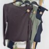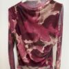 Camiseta de tela estilo tul, con estampado asimétrico con formas redondeadas como si hicieran olas. Cuello medio alto y manga semitransparente. Tela elástica. Viene en talla única perfecta desde la 34 a la 40.
