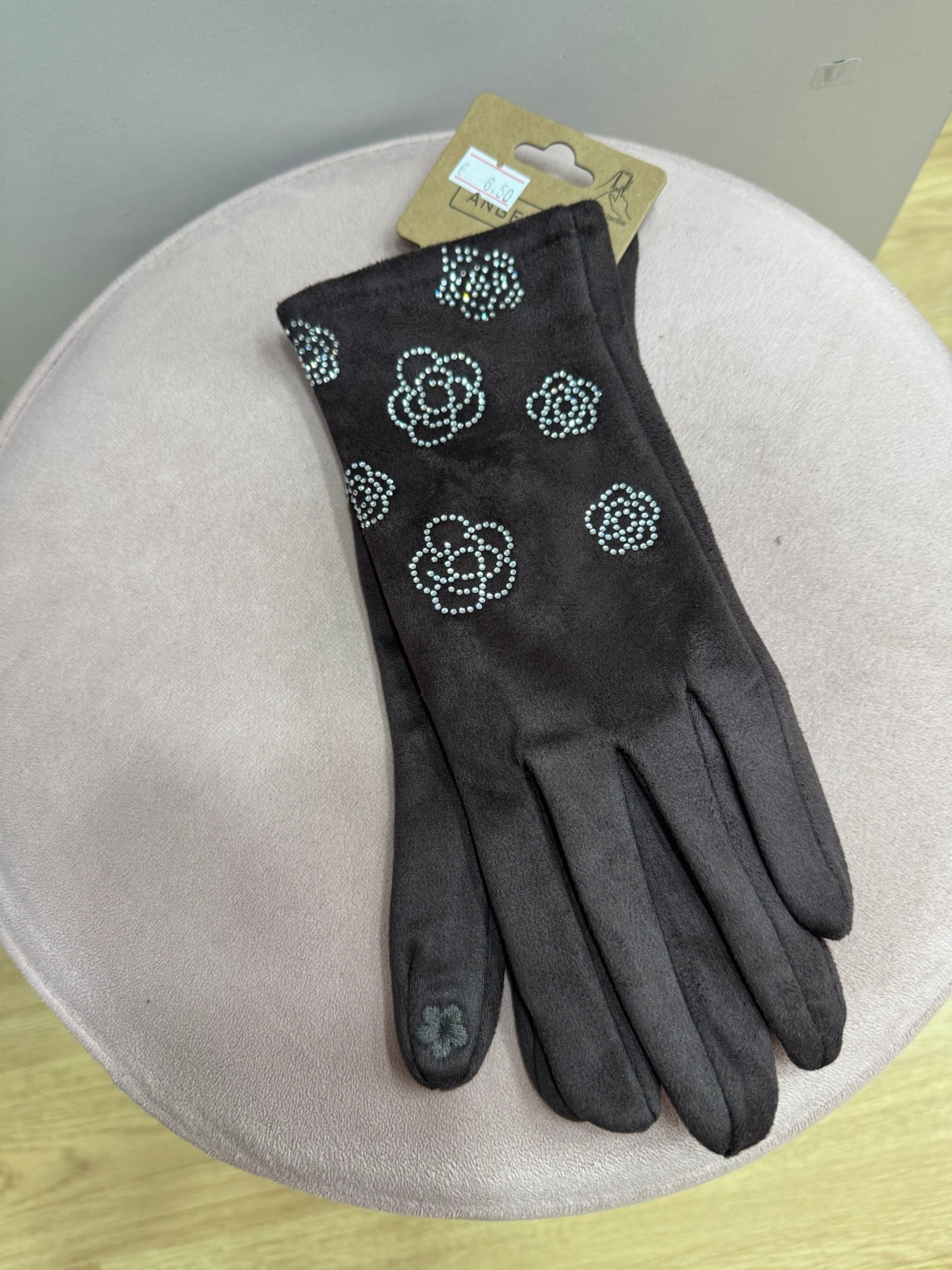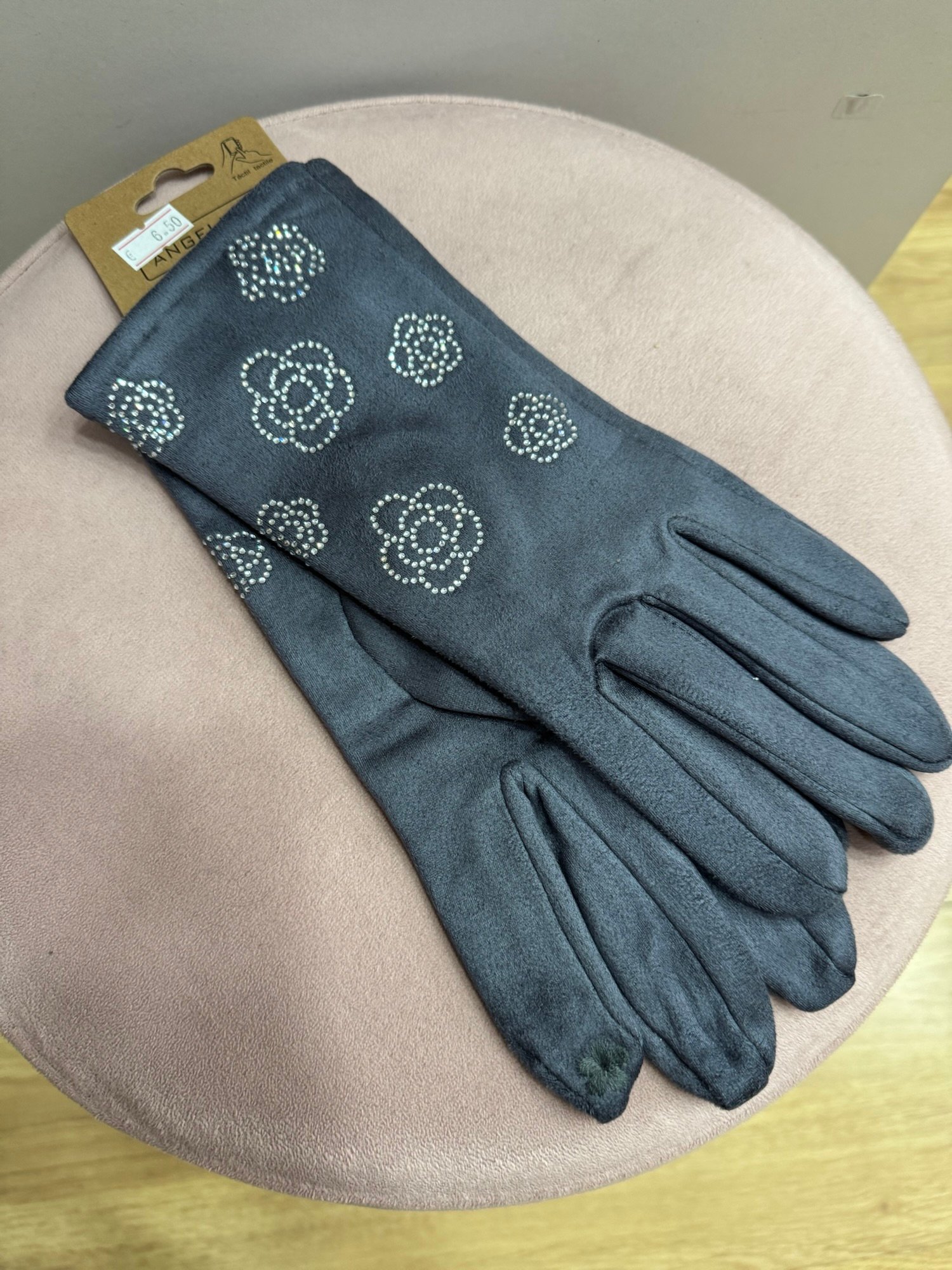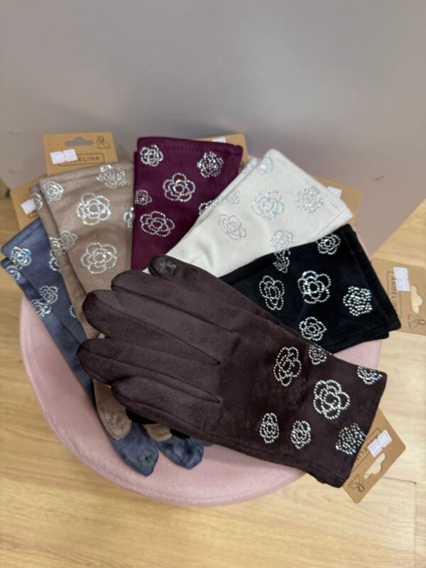 Guantes de antelina con terciopelo por dentro muy suave. Con detalle de flores de brillito en el exterior. Lleva flor bordada en el dedo para poder utilizar el móvil.