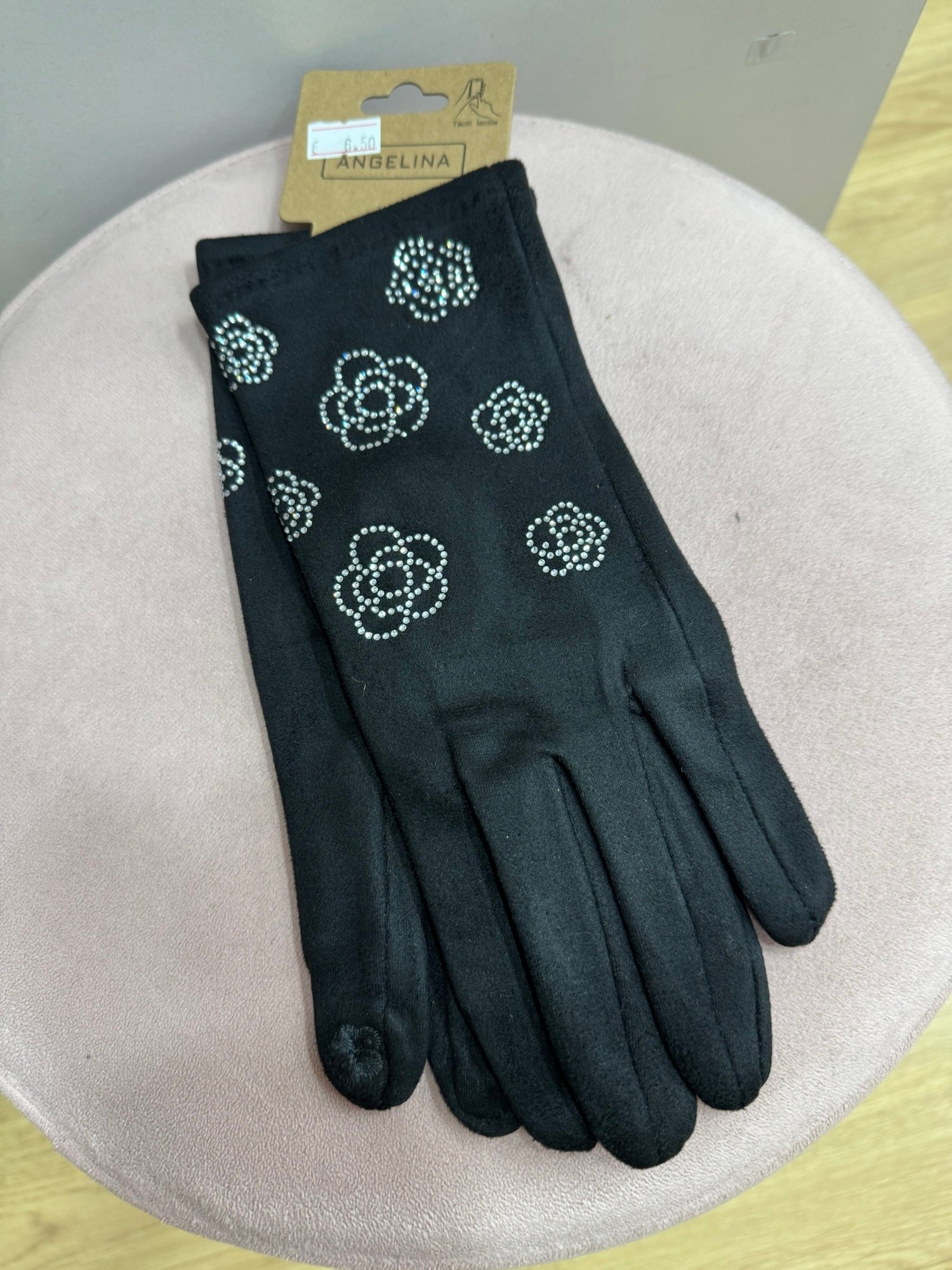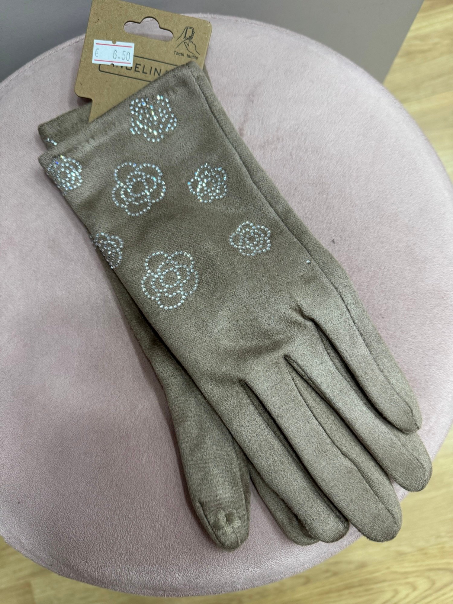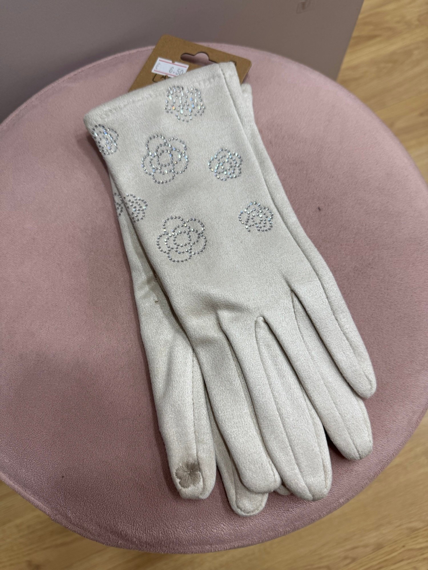 Guantes de antelina con terciopelo por dentro muy suave. Con detalle de flores de brillito en el exterior. Lleva flor bordada en el dedo para poder utilizar el móvil.