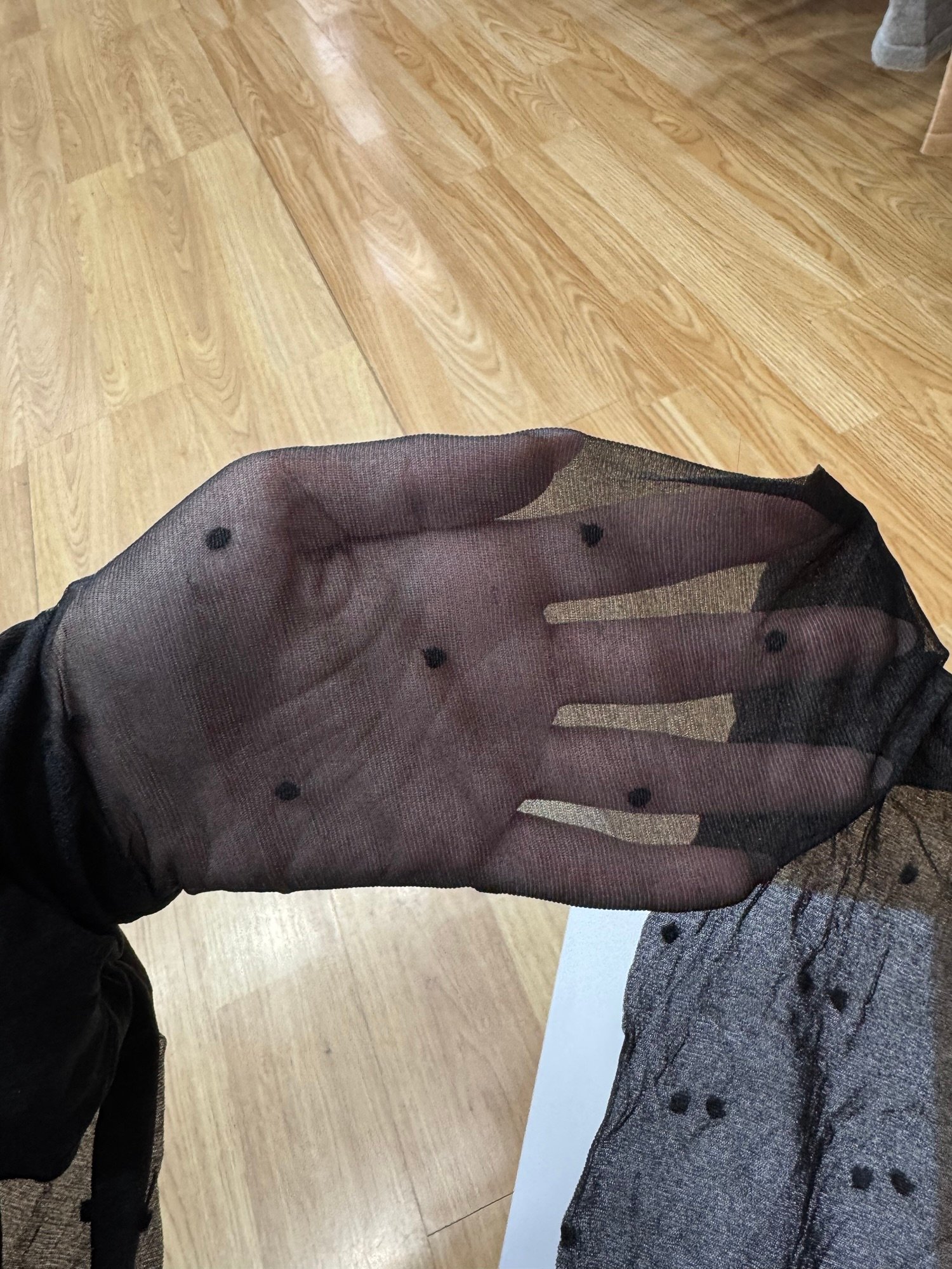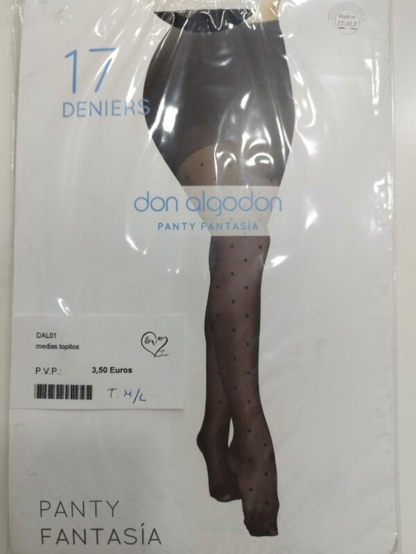 Panty de 17 denias en color negro con dibujo de topitos negros pequeños. La parte de la braguita viene tipo boxer. Rombo higiénico reforzado. Sin puntera y cintura anti presión.