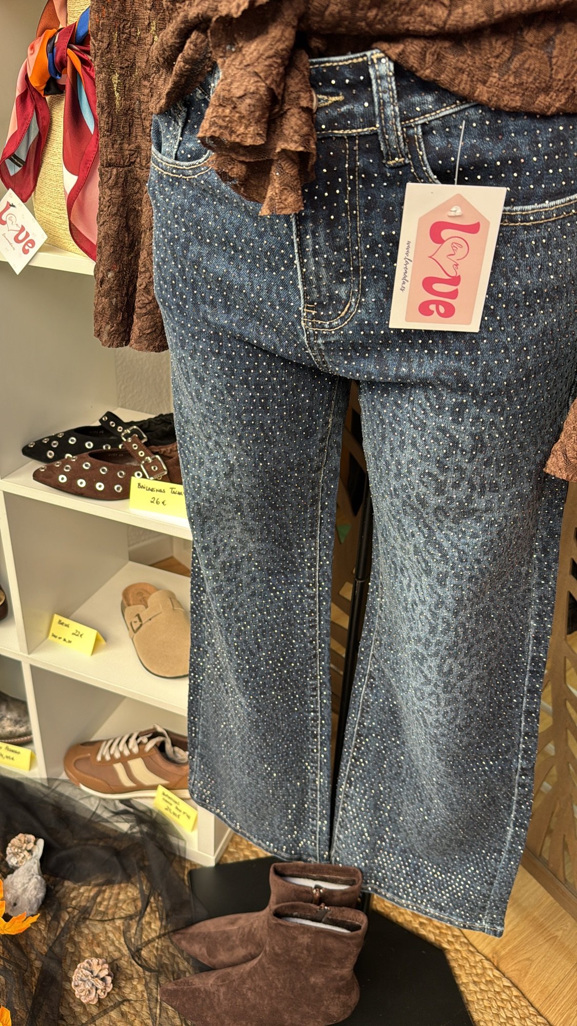 Vaquero con estampado sutil de animalprint y brillo en todo el pantalón tanto por delante como por detrás. Llevan elastano, pierna ancha y tiro alto.