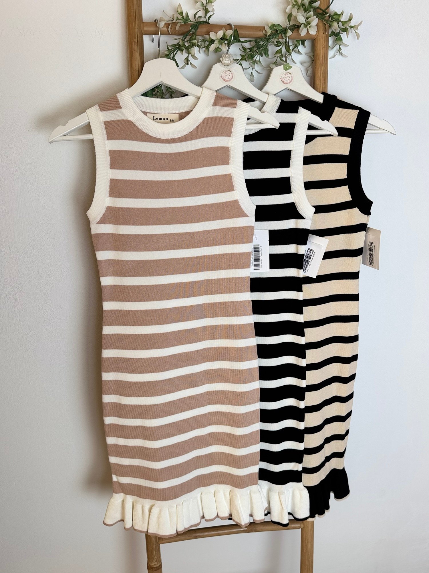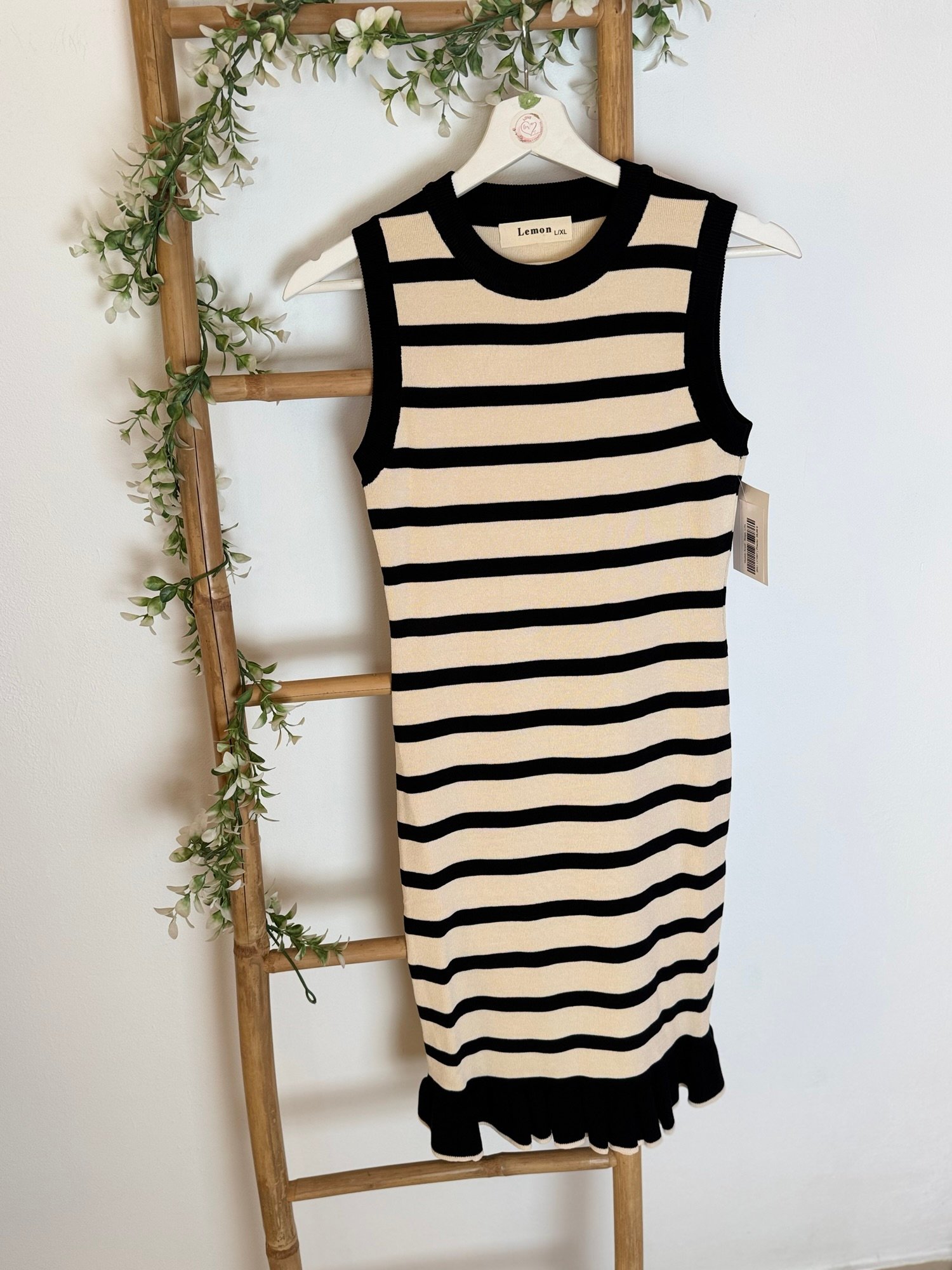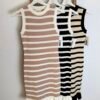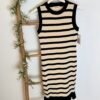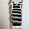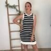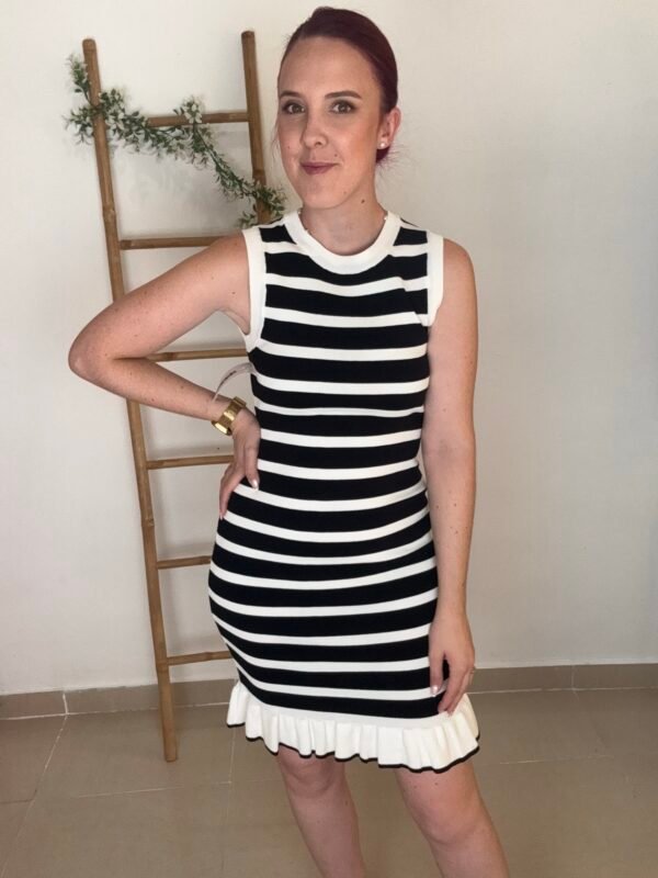Vestido corto de punto de rallas horizontales y detalle de volante en parte de abajo. Viene por tallas S/M(36/38) y L/XL(40/42)