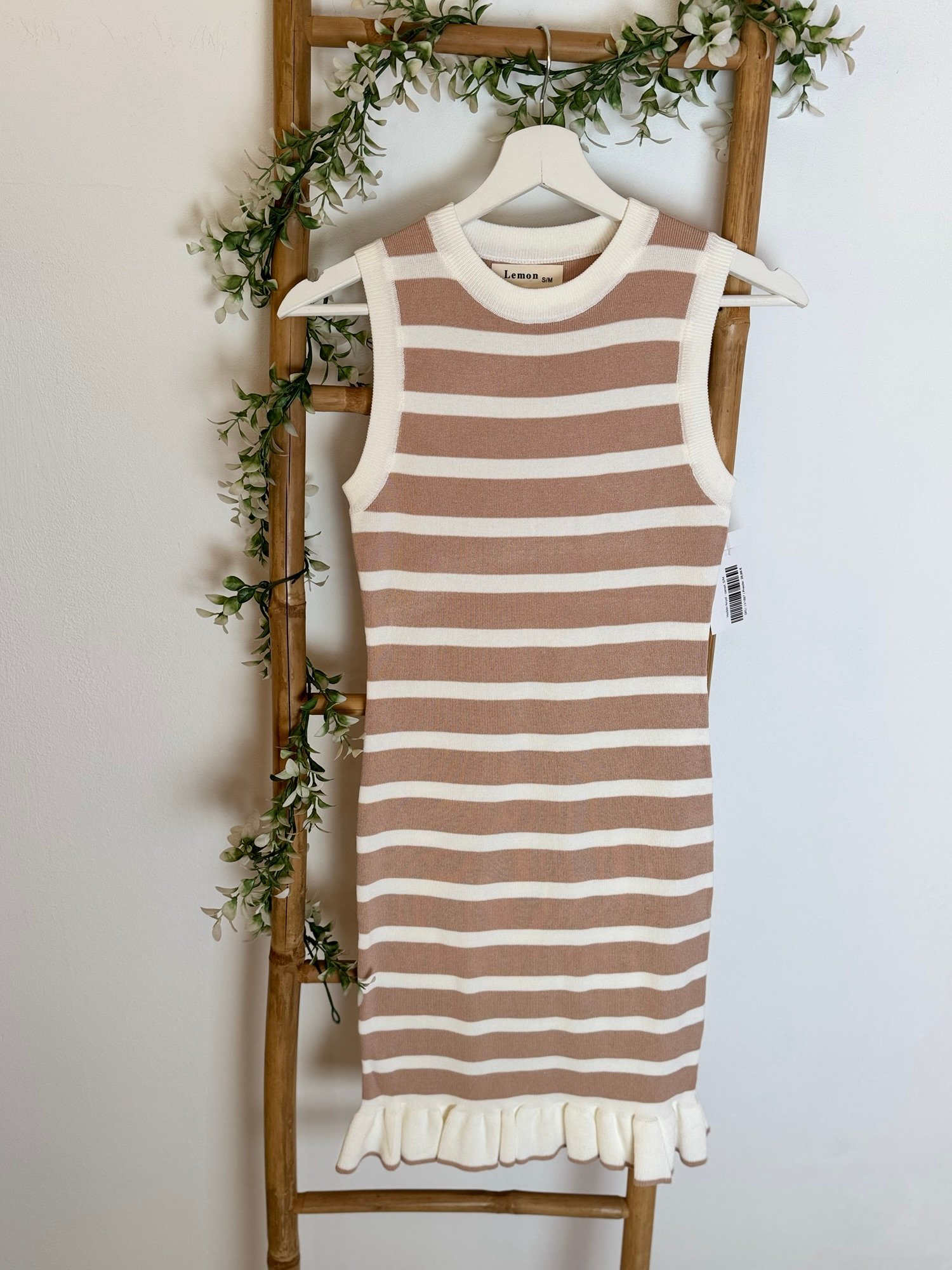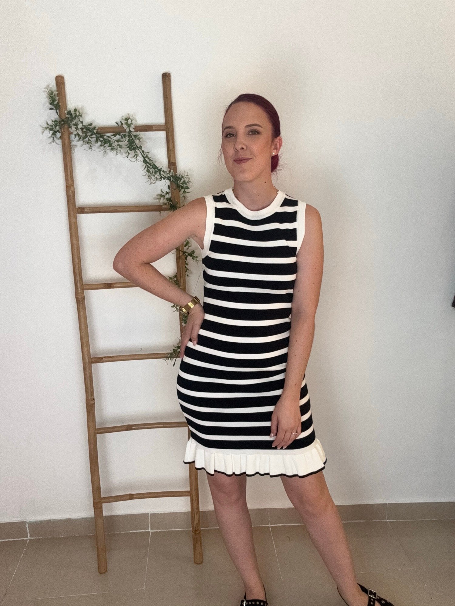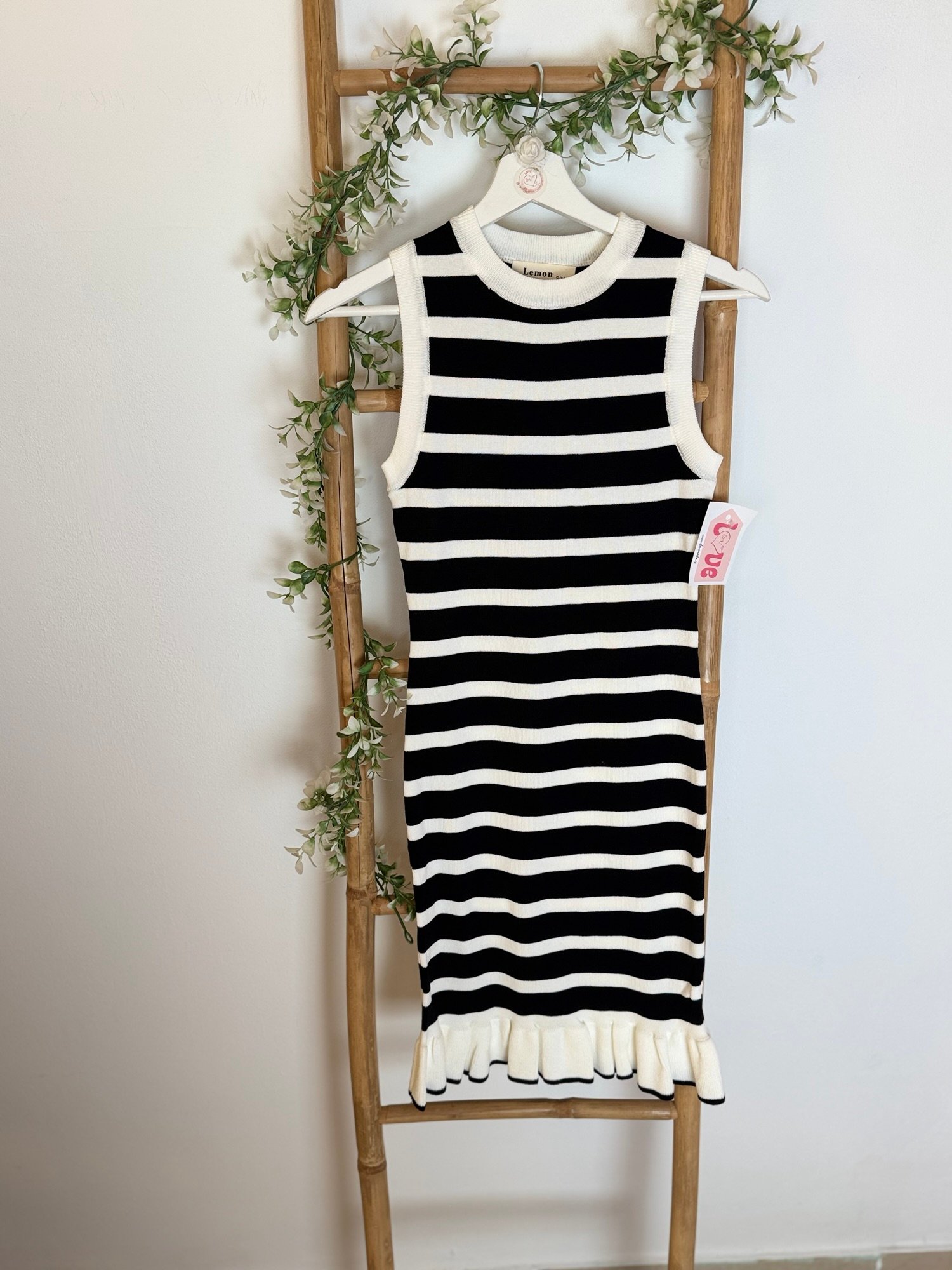 Vestido corto de punto de rallas horizontales y detalle de volante en parte de abajo. Viene por tallas S/M(36/38) y L/XL(40/42)