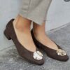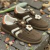 Zapatillas planas de polipiel con suela de tocino. Detalle de cordones de lazo con dos flores de ganchillo.